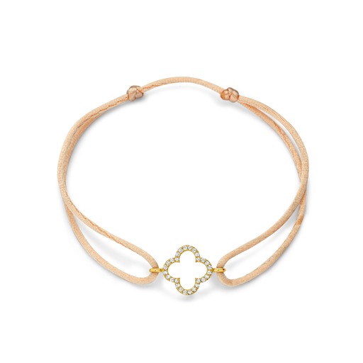 Een satijnen armbandje met een 14-karaats geelgouden Leaf-bedel, bezet met pavé diamanten met een totaalgewicht van 0.14 ct.