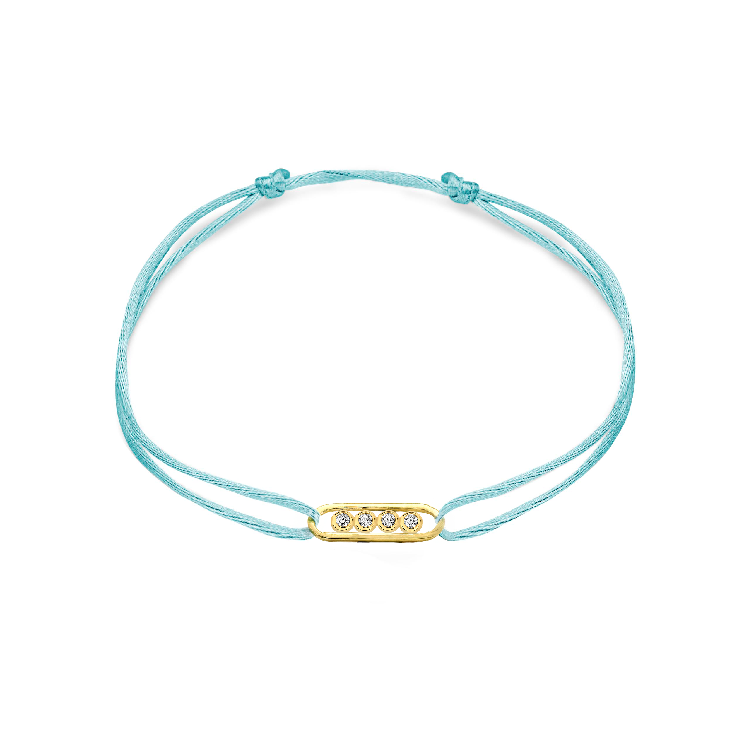 Een satijnen armbandje met een 14-karaats gouden paperclipbedel, verfijnd met vier gladgezette diamanten van 0.02 ct in het midden.
