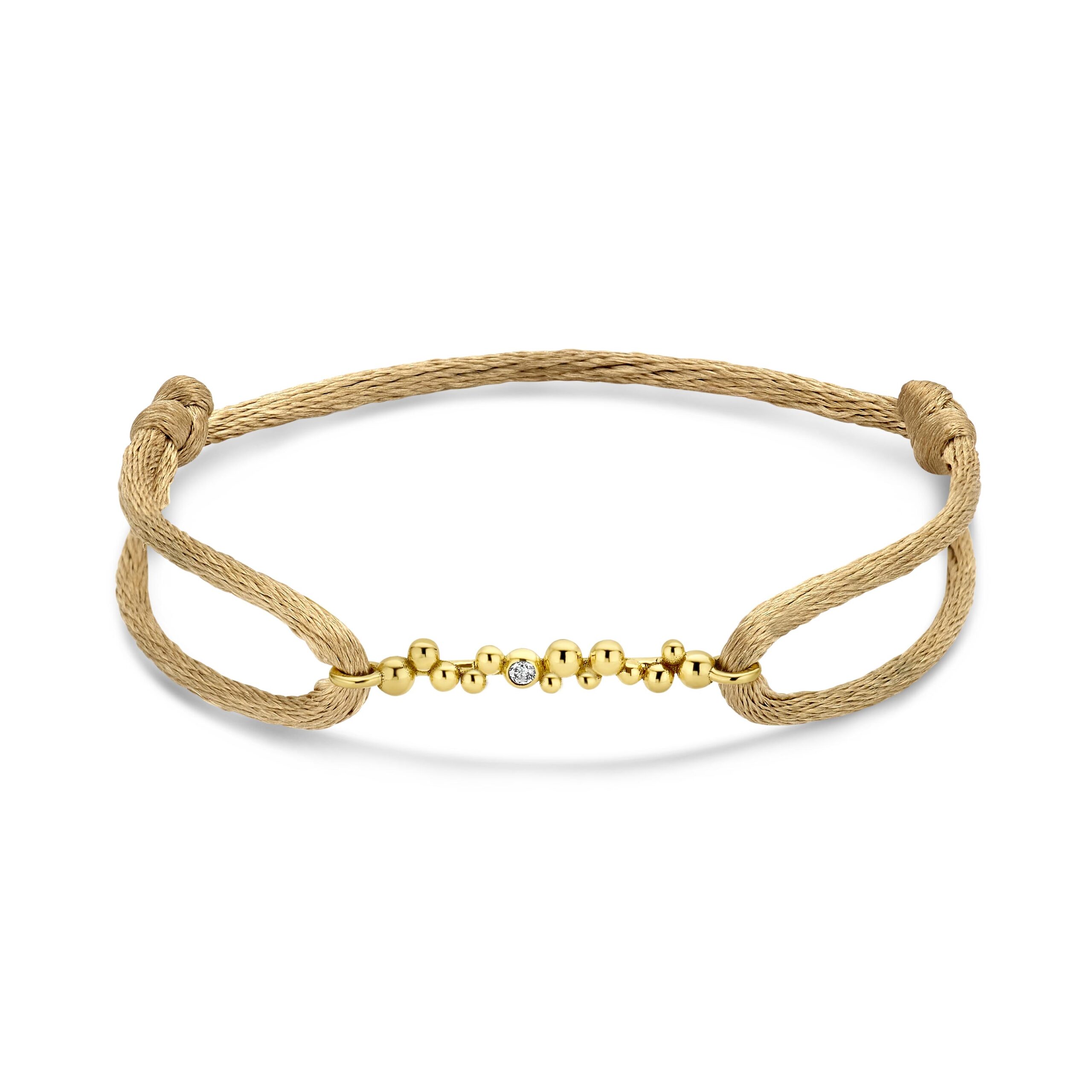 De satijnen armband Senna van Dots & Diamonds heeft een 14-karaats gouden bedel in de vorm van een lang staafje, versierd met het unieke Dotspatroon en een sprankelende diamant.
