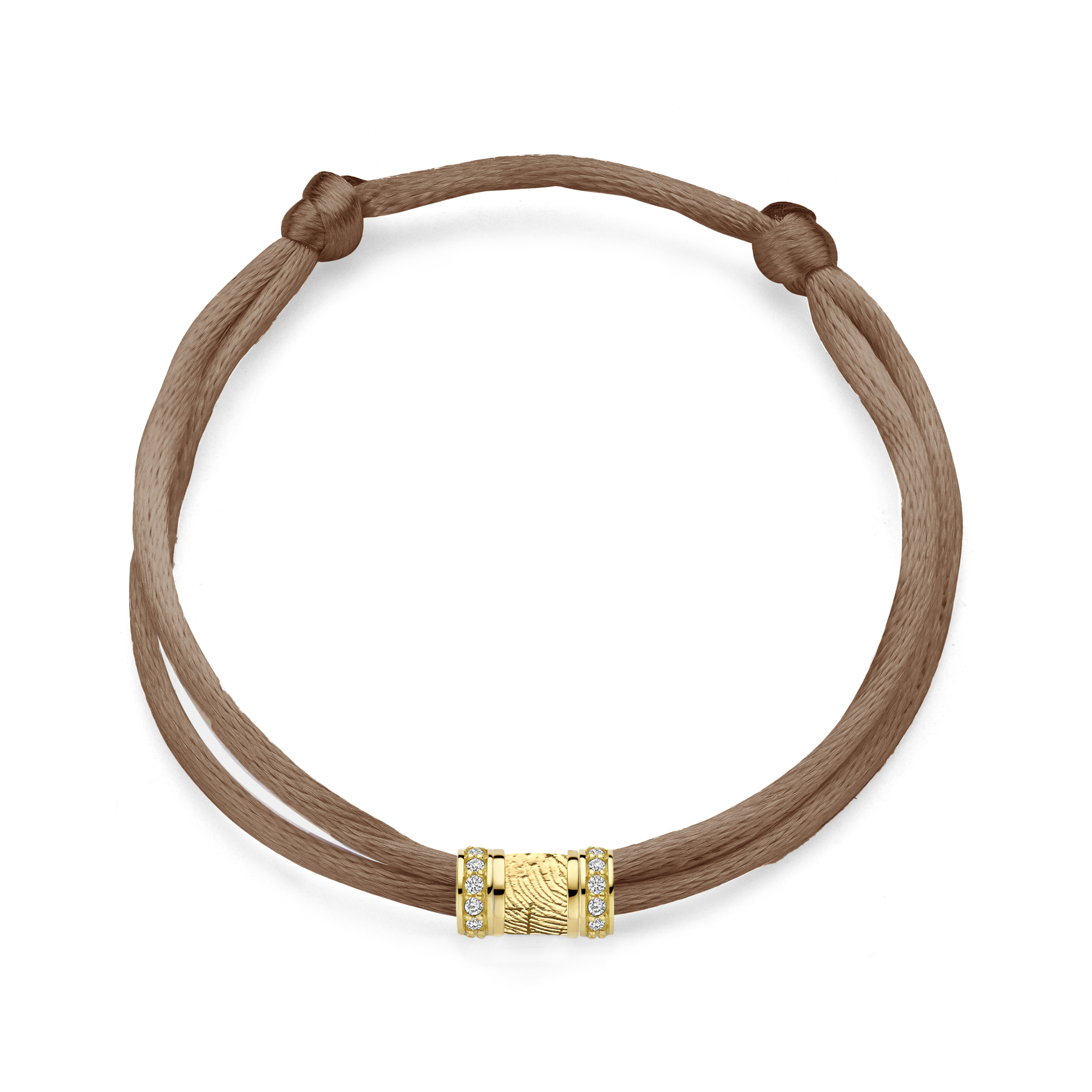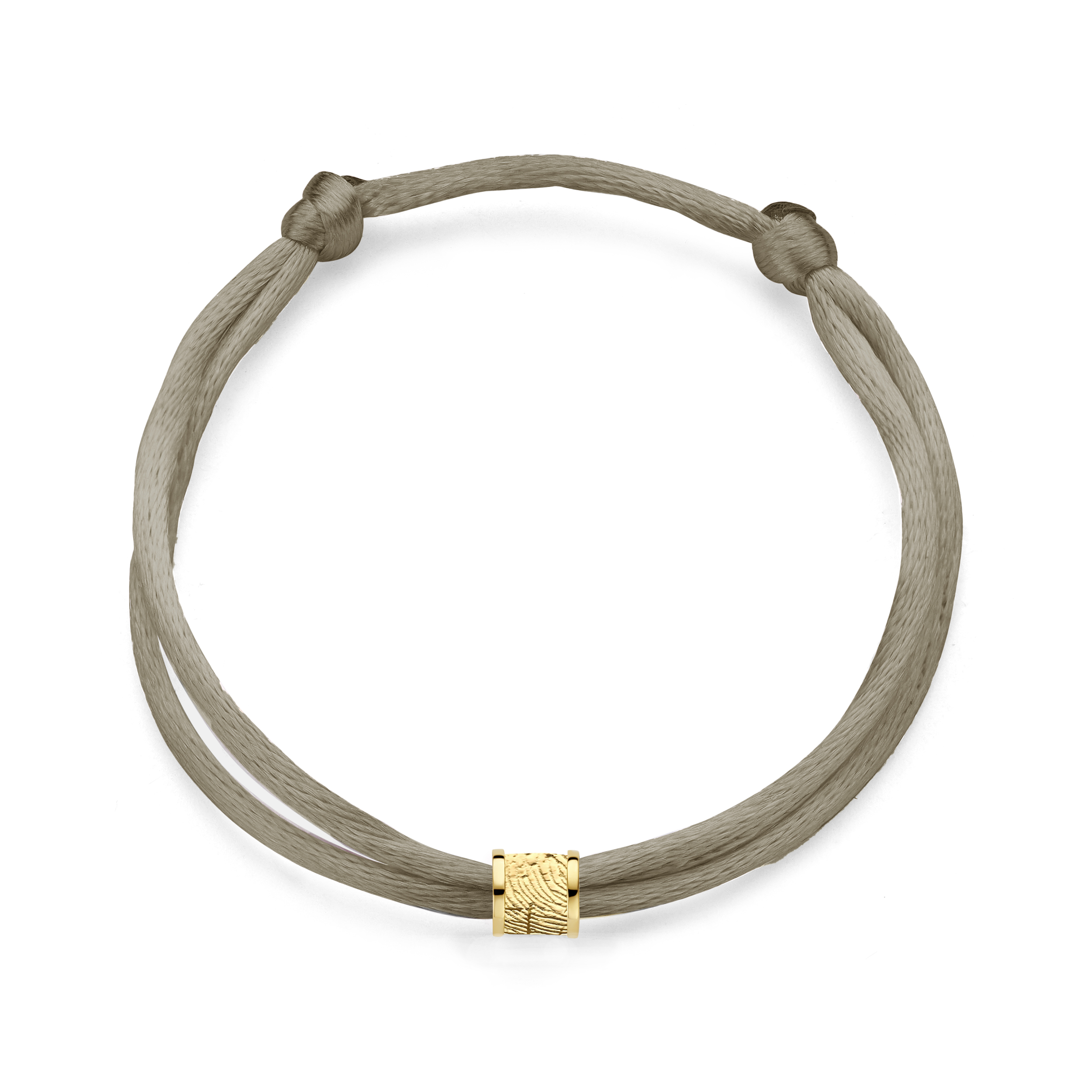 Ontwerp jouw persoonlijke Satin Charm Tube Touch armband van Minioro – een combinatie van verfijnd 14-karaats goud en een zacht satijnen koord naar keuze.
