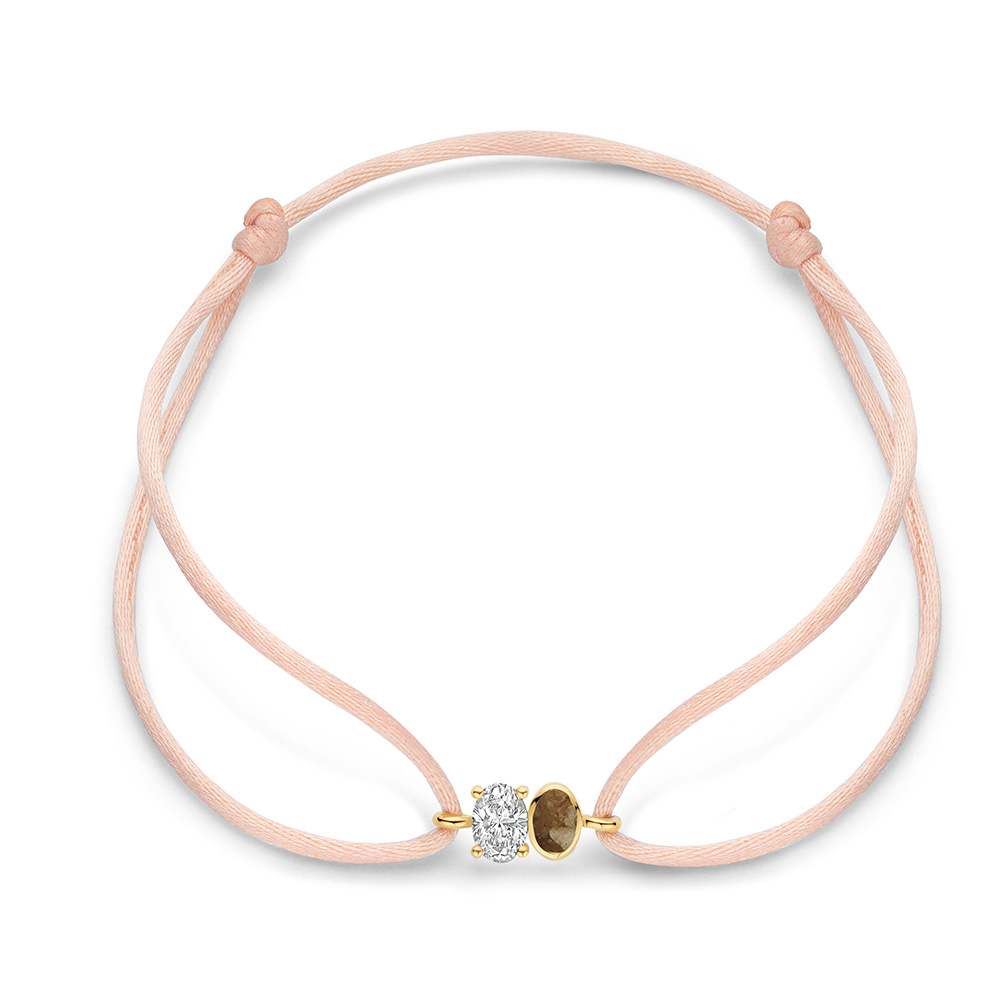 Een Satin armband met een zacht satijnkoord en een 14 karaats gouden zetting met een grote momentkamer in het midden. Aan beide zijden van de momentkamer is een lab grown diamant van 0.10 ct geplaatst.