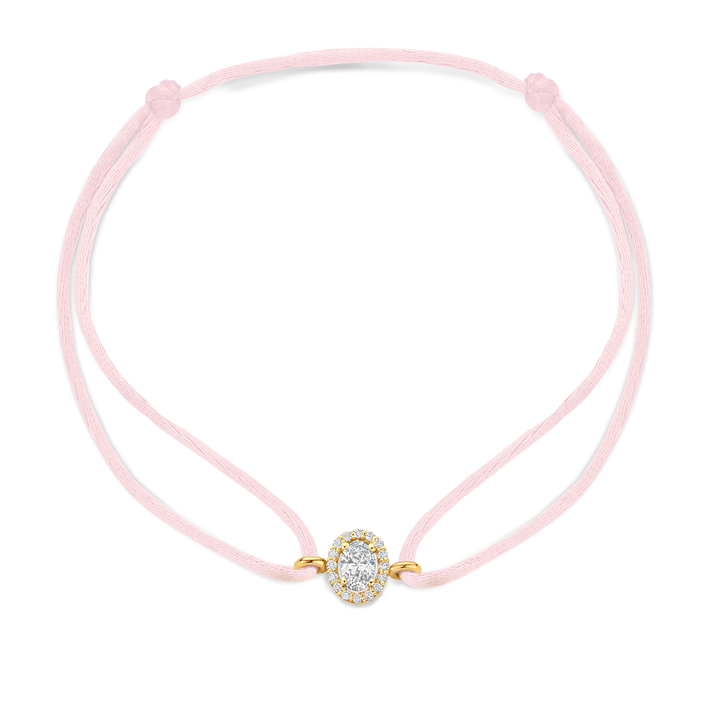 Een Satin armband met een zacht satijnkoord en een 14 karaats gouden zetting met een ovale lab grown diamant van 0.25 ct. De diamant is omringd door een halo van kleine briljant geslepen diamanten die zorgen voor een extra sprankelend effect.
