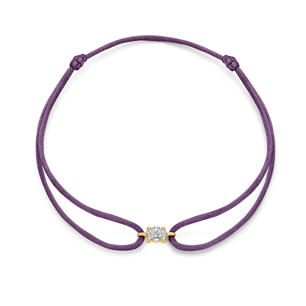 Een Satin armband met een zacht satijnkoord en een 14 karaats gouden zetting met vijf lab grown diamanten naast elkaar. Het minimalistische ontwerp laat de diamanten mooi tot hun recht komen en zorgt voor een subtiel sprankelend detail.
