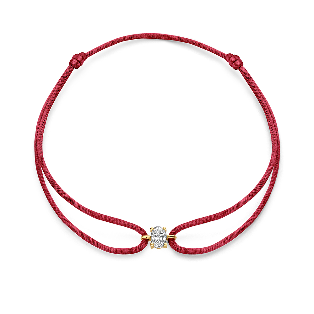 Een Satin armband met een zacht satijnkoord en een 14 karaats gouden zetting met een ovale lab grown diamant. Het minimalistische ontwerp laat de diamant mooi tot zijn recht komen en geeft de armband een subtiel sprankelend detail.