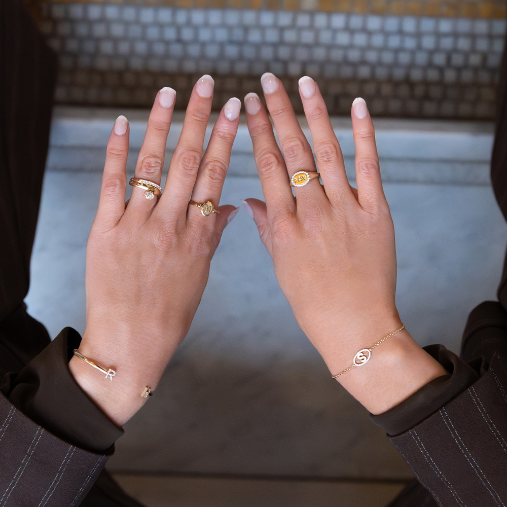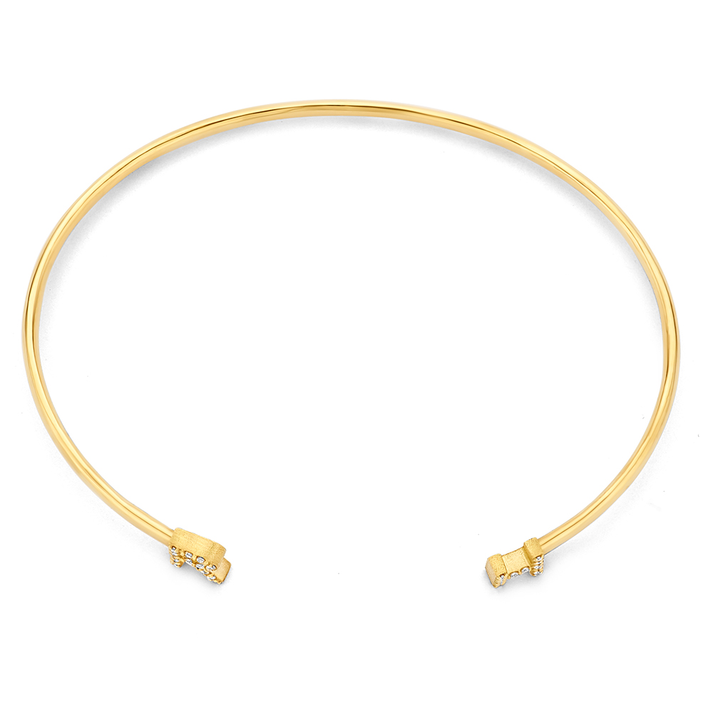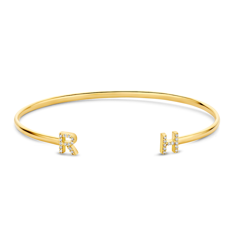 Een massieve spang armband van 14 karaats goud met twee pavé bezette initialen aan de uiteinden. De letters zijn gezet met kleine briljant geslepen diamanten die zorgen voor een subtiel sprankelend effect.